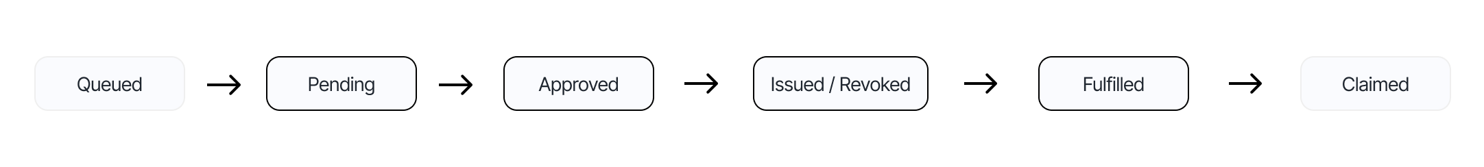 - Queued: An optional stage that requests go through if there was non-zero approved or issued/revoked but not yet fulfilled requests for this user.