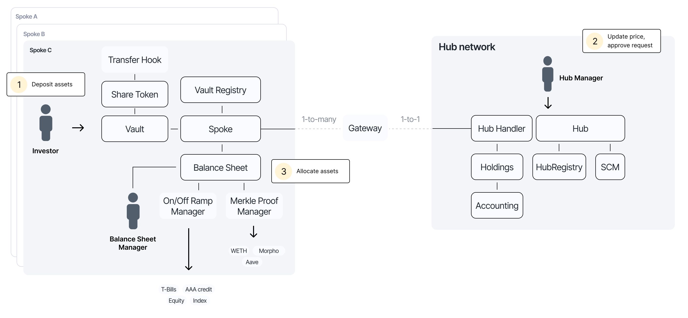The protocol combines an immutable core with a programmable vault stack for customization. The protocol allows customizing investment vaults, transfer hooks for compliance logic, balance sheet managers for asset allocation strategies, hub managers for automated pricing and order management, valuation contracts for asset pricing, per-pool cross-chain adapters, and much more. This architecture enables builders to innovate at the extension layer while maintaining the security guarantees of the immutable core.